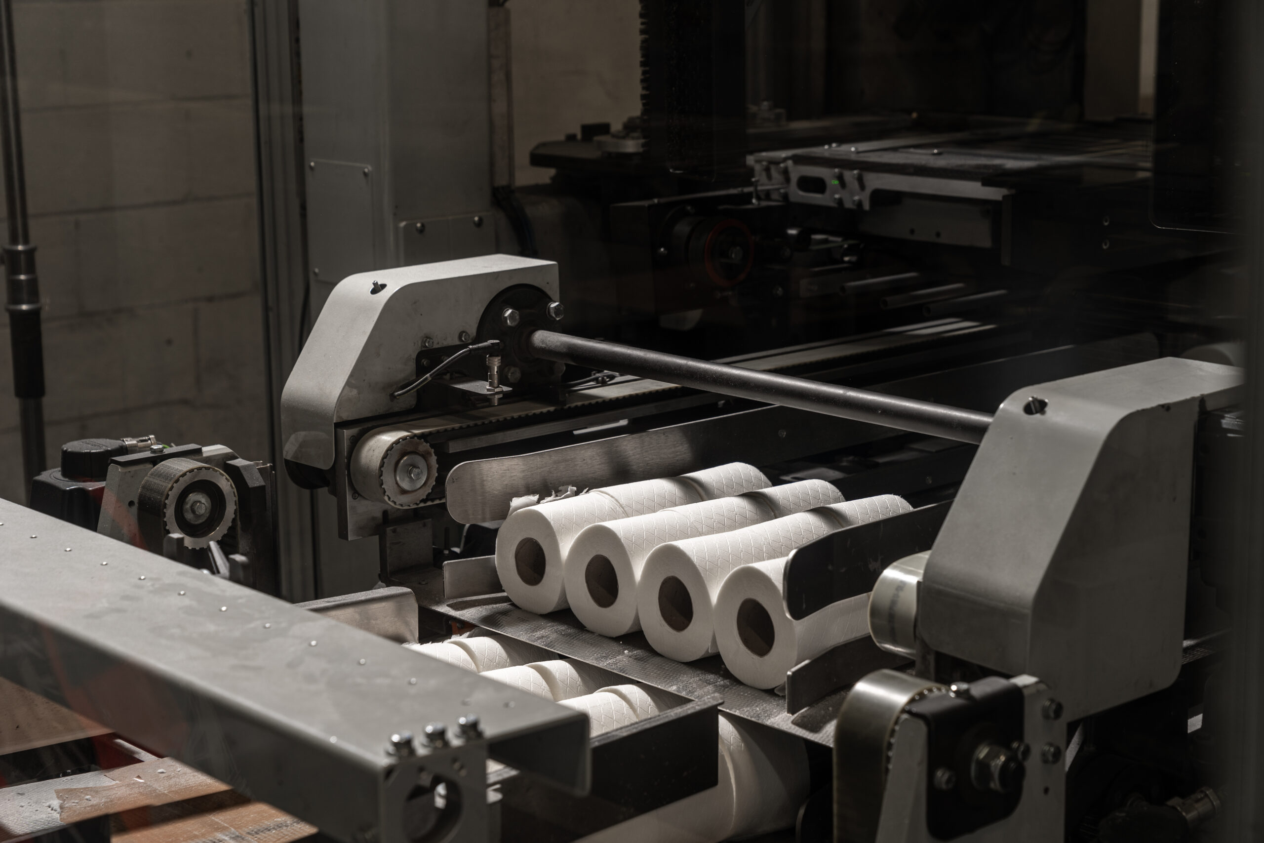 Seamless production of toilet rolls, centrefeed rolls, and kitchen towels.